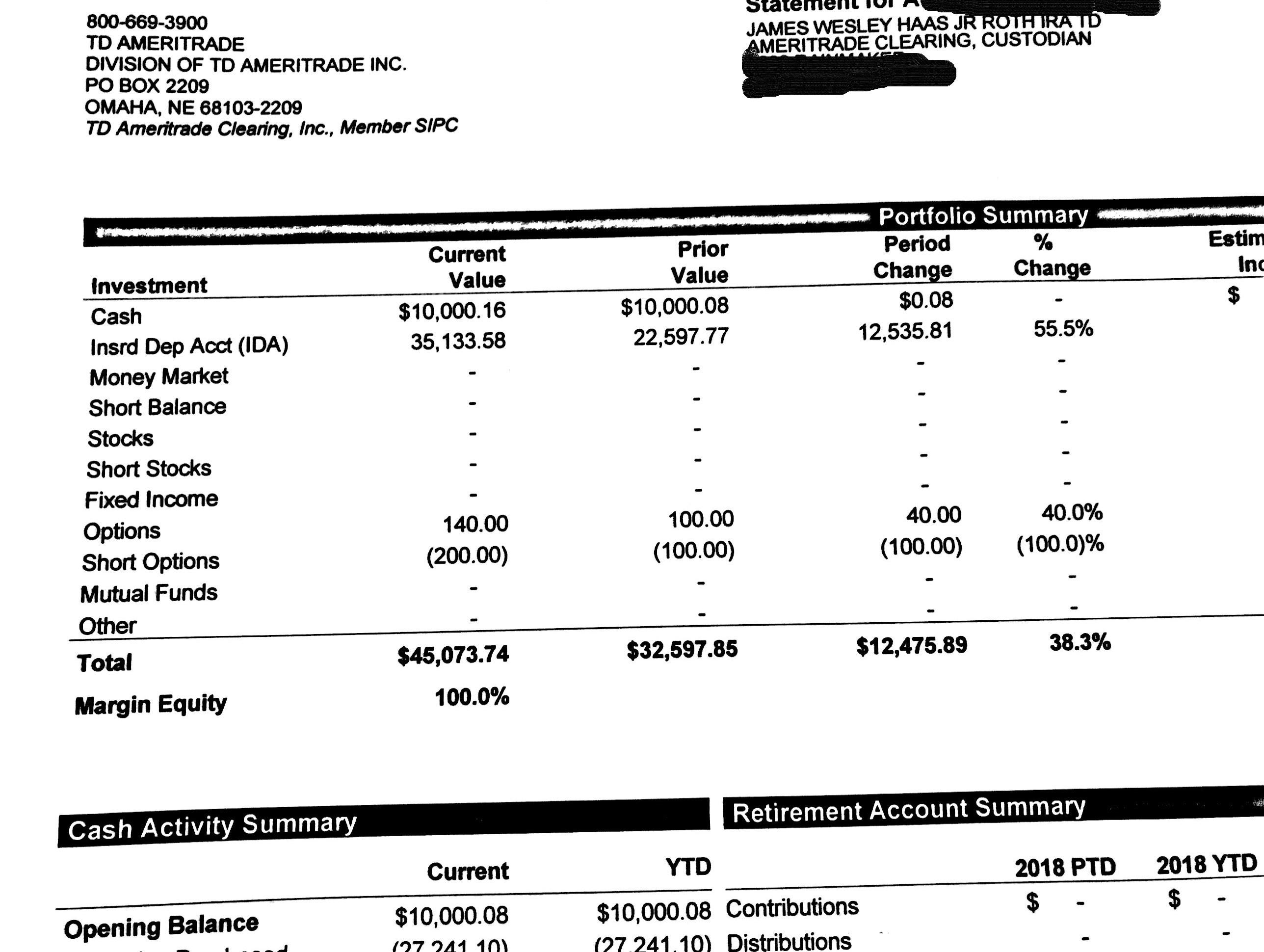 Jim Haas joined our 11-Hour Options Program and made $6,702 his first month, $4,710 his second month and $12,475 in month three. And the starting value in his accounts were between $23,000 and $33,000 (see below).