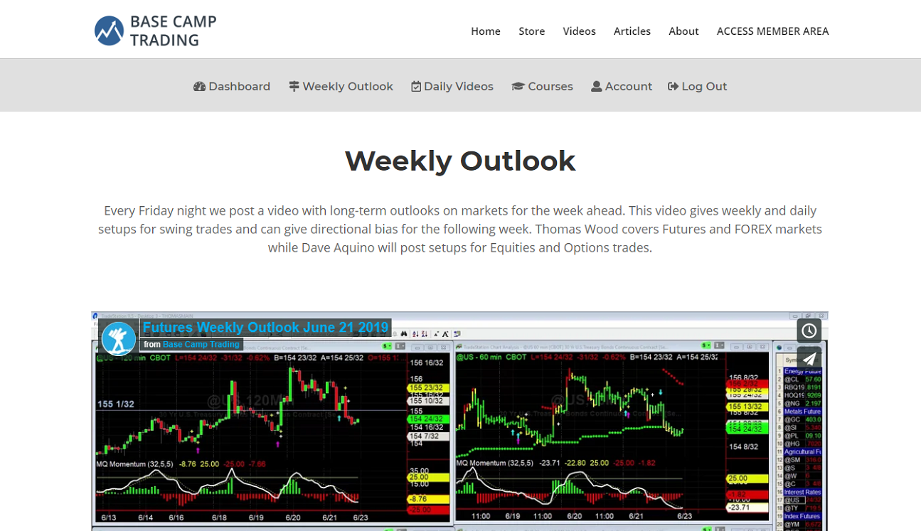 The Base Camp Trading Weekly Outlook gives you a bird’s-eye view of the market in 10 minutes or less. Every Friday night you’ll get up to speed with long-term outlook on markets for the week ahead. This video gives weekly and daily setups for swing trades and can give directional bias for the following week. Thomas Wood covers Futures markets while Dave Aquino will post setups for Equities and Options trades. And Gary Edwards will brief you on the London Futures markets.