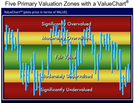 What exactly is value? Historically people have thought of value as a single price level that reflects the worth of an asset as defined by market participants. Something is only worth what people are willing to buy it for or what people are willing to sell it for. In extreme cases, if there are no buyers for an asset it is worthless and if there are no sellers of an asset it is priceless. Dictionary.com defines value as “relative worth, merit, or importance,” or, in another definition, as “monetary or material worth, as in commerce or trade.” Anther definition of value that I like is “the attractiveness of price as defined by market participants.” Expanding on this, the term valuation might be defined as “the relative attractiveness of price as defined by market participants across a range of different price levels.” Now that we understand the definition of value, the next logical question is “What are ValueCharts®?” ValueCharts® are like a Super Blue Book for the markets. Like the Blue Book used in the used auto industry, ValueCharts® can be used to define fair value. ValueCharts® go well beyond the Blue Book by defining fair value as a price range instead of a single price level. In addition, ValueCharts® define overvalued and undervalued price levels as well. Specifically, ValueCharts® define the valuation of any market by plotting price in one of five primary valuation zones (listed below). The five valuation zones are colored coded to allow investors to quickly and easily identify the current valuation state of any market. The five valuation zones are as follows: